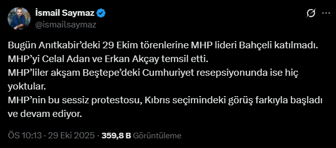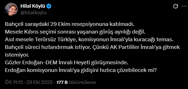 "Bahçeli saraydaki 29 Ekim resepsiyonuna katılmadı. Mesele Kıbrıs seçimi sonrası yaşanan görüş ayrılığı değil. Asıl mesele Terörsüz Türkiye, komisyonun İmralı'yla kuracağı temas. Bahçeli süreci hızlandırmak istiyor. Çünkü AK Partililer İmralı'ya gitmek istemiyor. Gözler Erdoğan-DEM İmralı Heyeti görüşmesinde. Erdoğan komisyonun İmralı'ya gidişini hızlıca çözebilecek mi?"