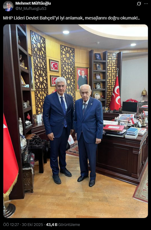Bahçeli ile fotoğrafını paylaşan Müftüoğlu, "MHP Lideri Devlet Bahçeli’yi iyi anlamak, mesajlarını doğru okumak!" dedi.