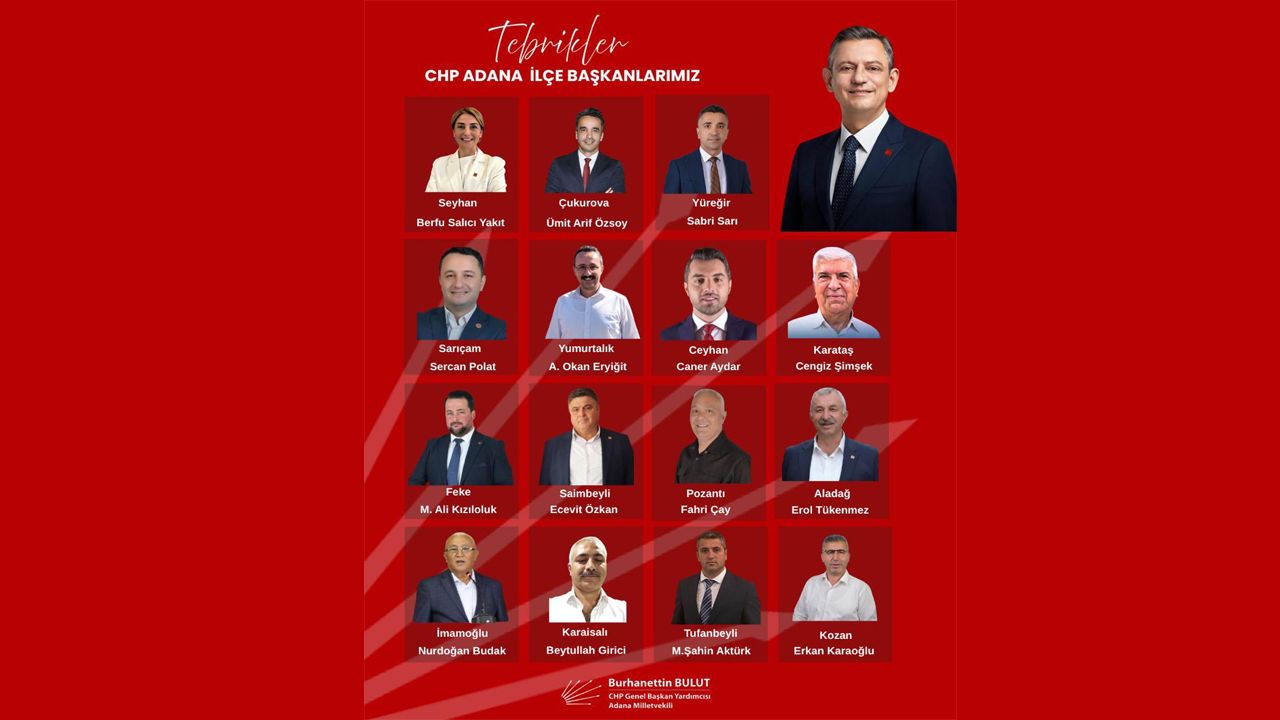 "Adana’da partimizin olağan ilçe kongrelerinde görev üstlenen tüm ilçe başkanlarımızı ve yönetim kurulu üyelerimizi yürekten kutluyorum. Genel Başkanımız Sayın Özgür Özel’in liderliğinde başlattığımız iktidar yürüyüşümüzde bugüne dek olduğu gibi bundan sonra da göstereceğiniz cesaret ve kararlılık, bu hukuksuz ve karanlık dönemde halkımızın umudunu büyütecek; adalet, eşitlik ve dayanışma mücadelemize güçlü bir katkı sunacaktır. Sizlerin gayreti partimizin ve milletimizin aydınlık yarınlarına yön verecek en değerli güçtür. Yolumuz açık, mücadelemiz kararlı olsun… Hep birlikte daha güzel, daha adil yarınlara..."