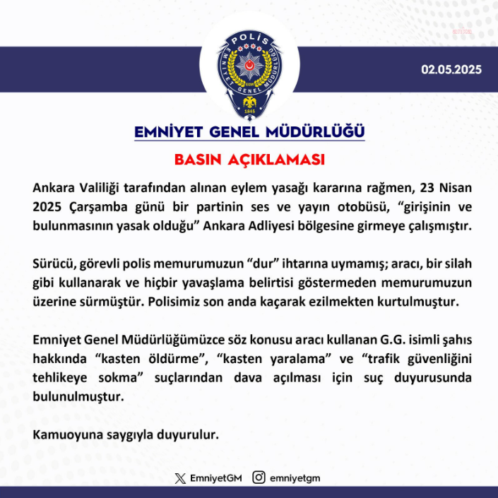 “Ankara Valiliği tarafından alınan eylem yasağı kararına rağmen 23 Nisan 2025 Çarşamba günü bir partinin ses ve yayın otobüsü, ‘girişinin ve bulunmasının yasak olduğu’ Ankara Adliyesi bölgesine girmeye çalışmıştır. Sürücü, görevli polis memurumuzun ‘dur’ ihtarına uymamış; aracı bir silah gibi kullanarak ve hiçbir yavaşlama belirtisi göstermeden memurumuzun üzerine sürmüştür. Polisimiz son anda kaçarken ezilmekten kurtulmuştur.
