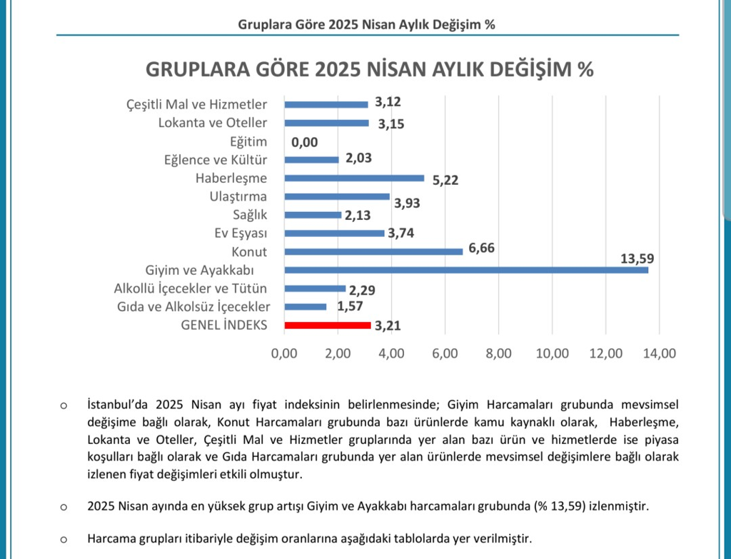 GİYİM VE AYAKKABI HARCAMALARINDA YÜZDE 13 ARTIŞNisan ayında İstanbul Tüketici Fiyat İndeksinde; bir önceki aya göre giyim ve ayakkabı harcamaları grubunda yüzde 13,59, konut harcamaları grubunda yüzde 6,66, haberleşme harcamaları grubunda yüzde 5,22, ulaştırma harcamaları grubunda yüzde 3,93, ev eşyası harcamaları grubunda yüzde 3,74, lokanta ve oteller harcama grubunda yüzde 3,15, çeşitli mal ve hizmetler harcama grubunda yüzde 3,12, alkollü içecekler ve tütün harcamaları grubunda yüzde 2,29, sağlık harcamaları grubunda yüzde 2,13, eğlence ve kültür harcamaları grubunda yüzde 2,03, gıda ve alkolsüz içecekler harcama grubunda yüzde 1,57 artış olurken, eğitim harcamaları grubunda değişim olmadı.